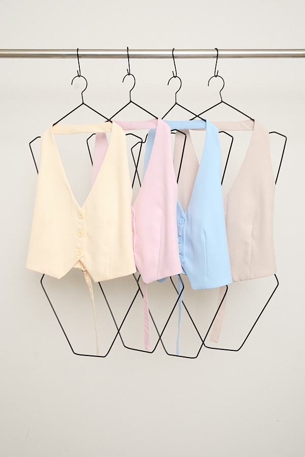 Chaleco sastrero de escote en V. Presenta una abertura en la espalda con pasador metálico de medialuna y cierre frontal con botones a tono. Un diseño versátil para sumar a tus looks de sastrería.