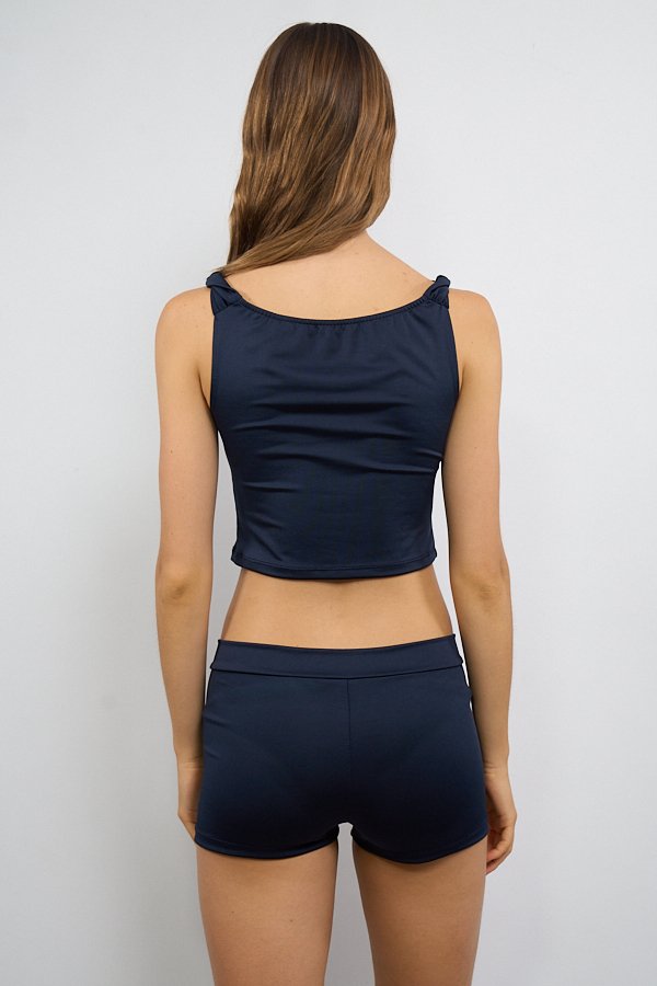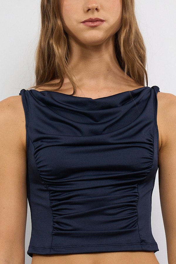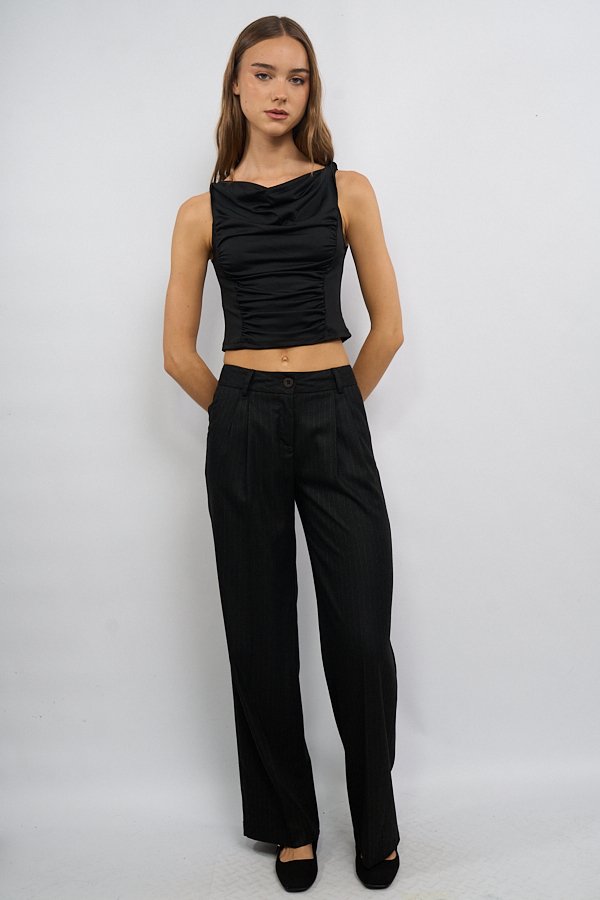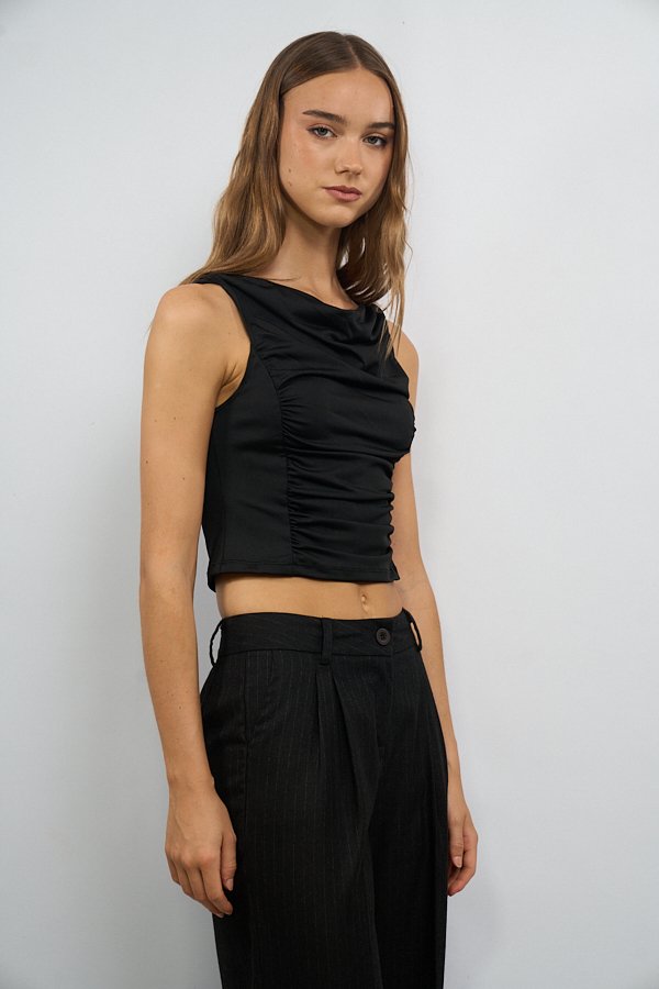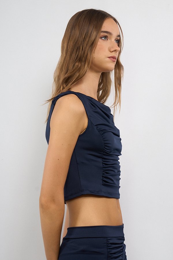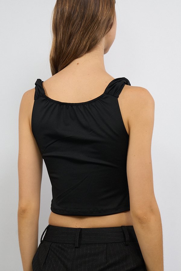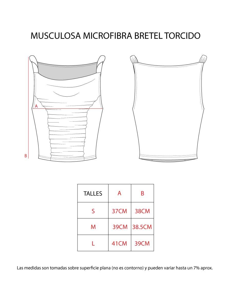 Musculosa confeccionada en tela Ity, con breteles con torzado como detalle del diseño. Presenta frunce en el centro del delantero y escote con sutil buche, generando un leve drapeado en la parte superior.