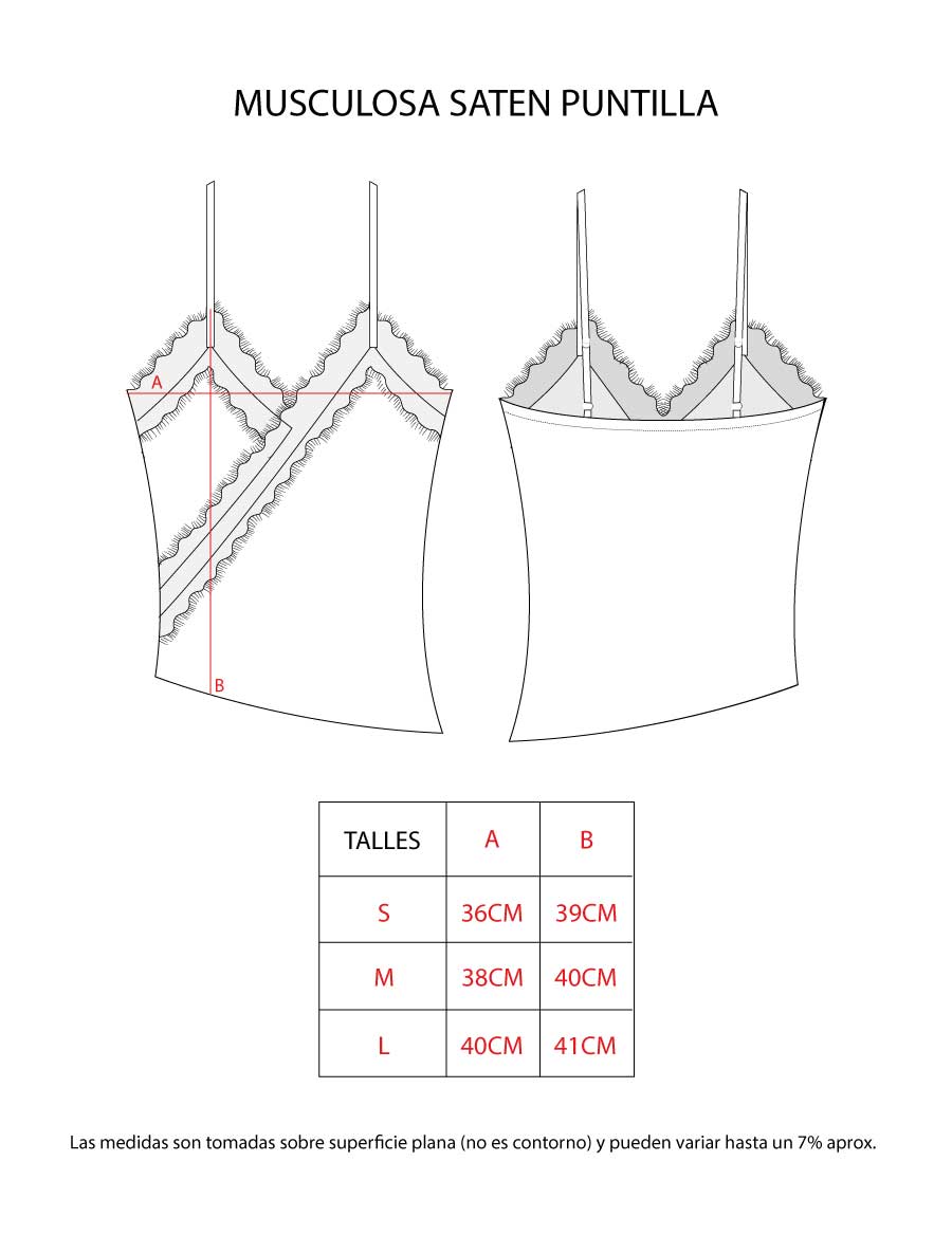 Musculosa confeccionada en satén con delicados detalles de puntilla. Presenta escote en V y terminación asimétrica en pico, que estiliza la prenda. Breteles finos con reguladores para un calce cómodo y adaptable.
