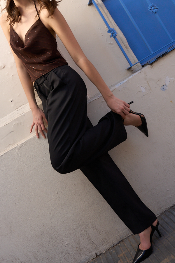 Pantalón cigarette de calce estilizado con delicadas tablas en el frente que aportan estructura. Detalle de pinzas en la espalda para un ajuste preciso y bolsillos diagonales funcionales. Cierre frontal con cremallera y botón.