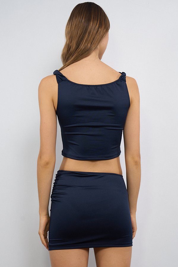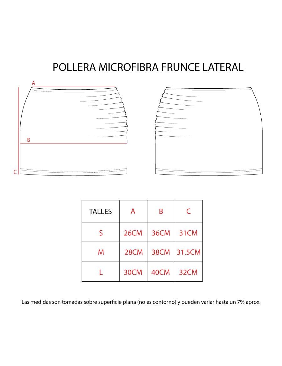 Pollera confeccionada en tela Ity, de tiro medio bajo. Presenta frunce en el lateral izquierdo que aporta un detalle distintivo al diseño. Incorpora elástico en la cintura, brindando mayor comodidad y adaptación al cuerpo.