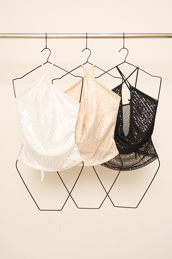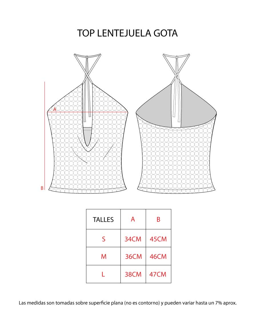 Top confeccionado en lentejuela, con escote cruzado que forma una gota central. Cuenta con forrería en el delantero, aportando una mejor terminación. La espalda presenta elástico, lo que permite un calce cómodo y adaptable. Los breteles se atan al cuello, realzando el escote y permitiendo regular la prenda.