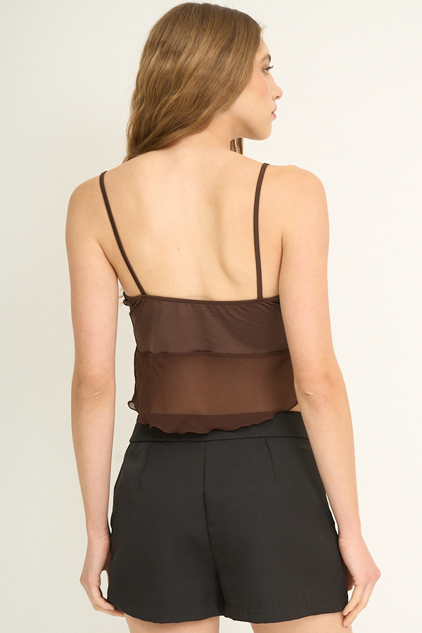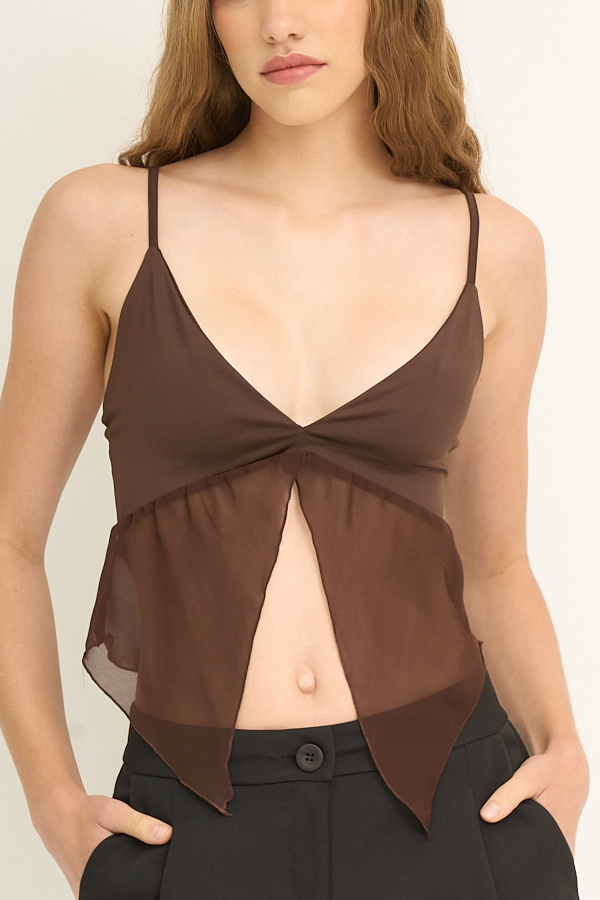 Top de breteles finos y escote en V con delicados picos de gasa que aportan movimiento. La espalda con elástico garantiza un calce cómodo y adaptable.