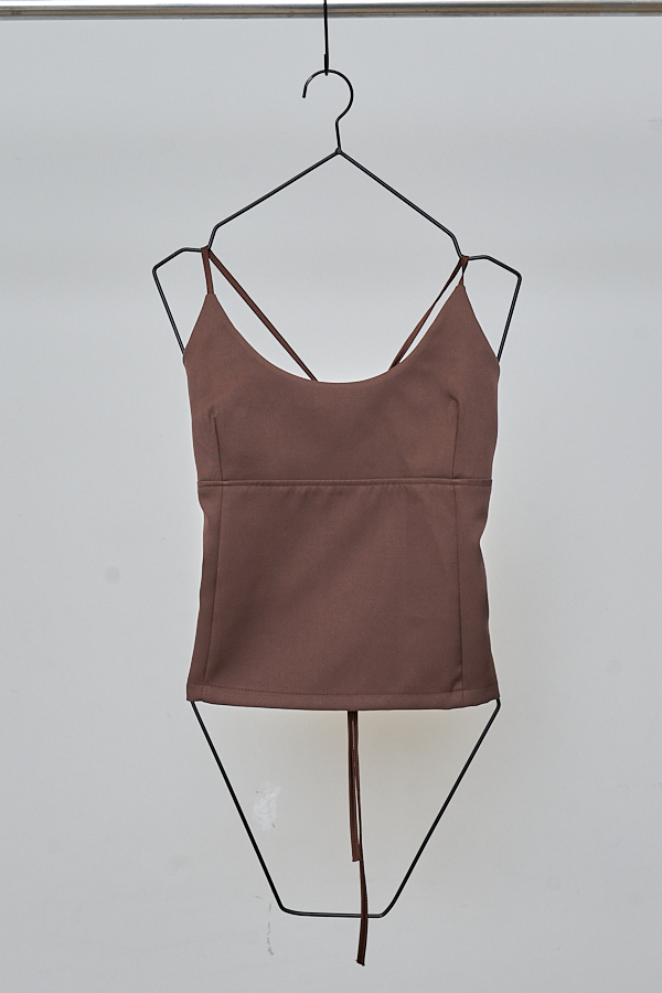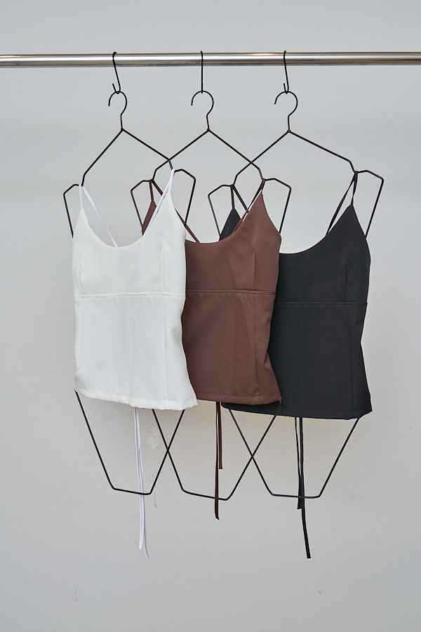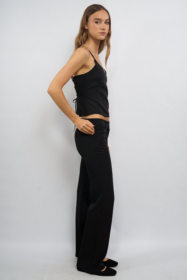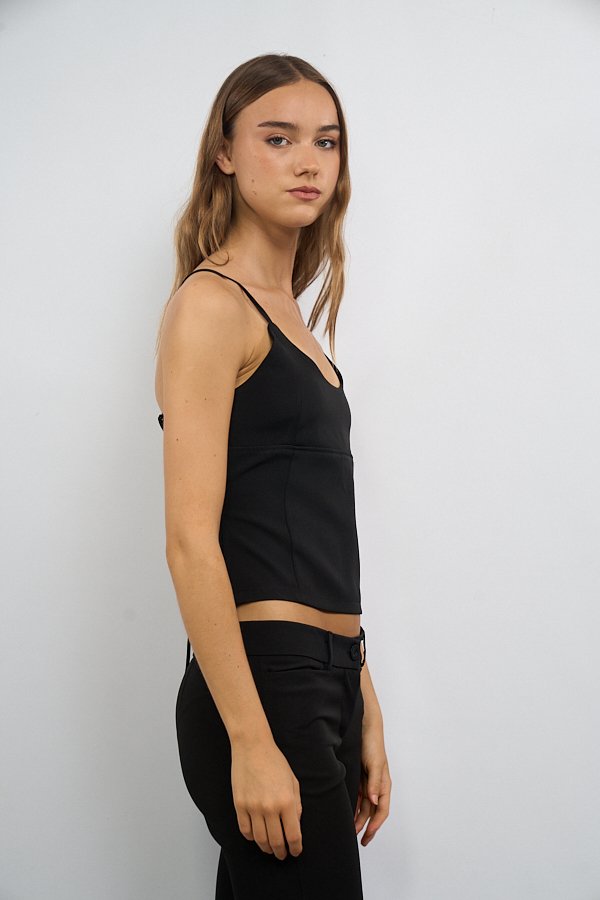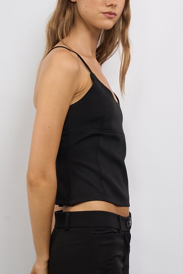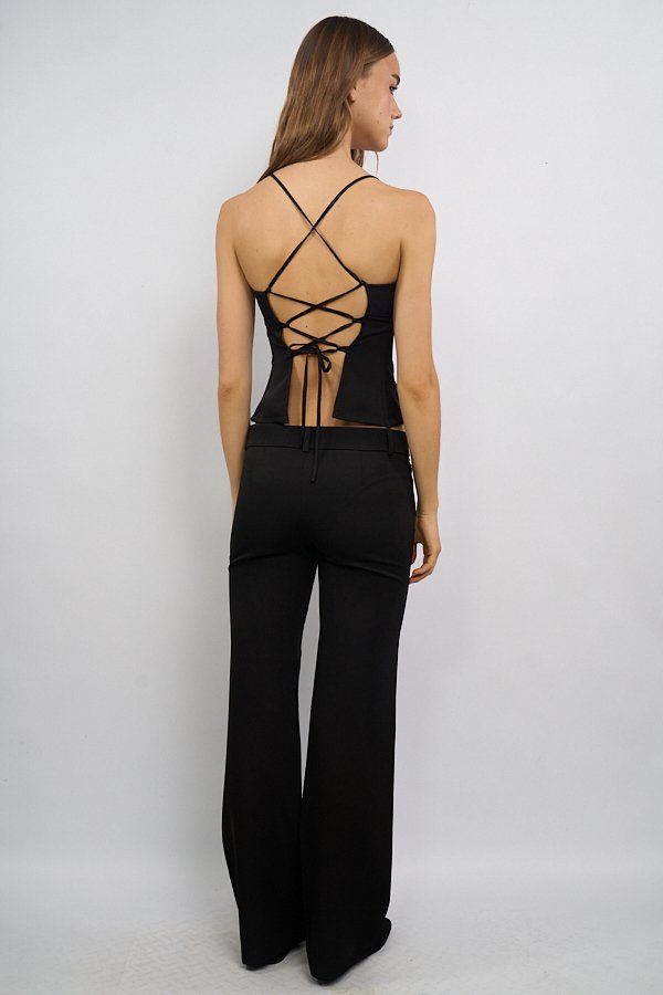 Top tipo corset con recortes en el delantero que realzan la silueta. En la espalda presenta ojales por donde pasa una tira para ajustar, permitiendo regular el calce y aportando un detalle distintivo al diseño.