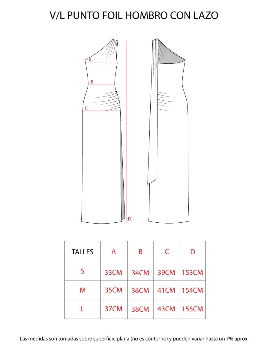 Vestido largo confeccionado en punto foil. Presenta diseño de un solo hombro, del cual parte un lazo que puede usarse suelto, al cuello o con distintas variantes. Incorpora frunce en la cadera y tajo lateral. La espalda lleva elástico para un mejor ajuste, y el escote cuenta con elástico invisible que aporta un mejor acabado.