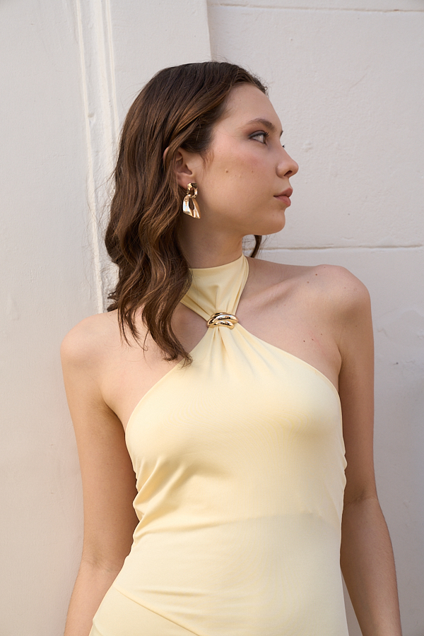 Vestido corto confeccionado en tela de punto. Cuenta con cuello halter con pasador metálico y se anuda en la espalda. La falda presenta frunce en uno de los laterales, lo que aporta un detalle favorecedor al diseño.