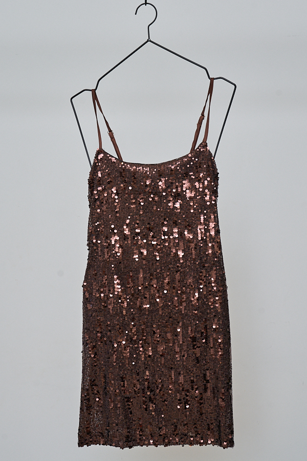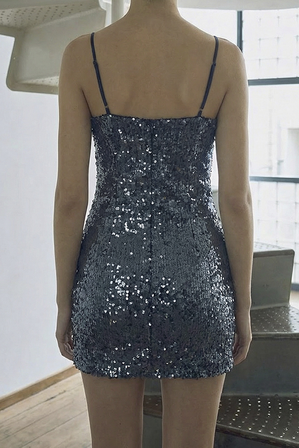 Vestido corto confeccionado en lentejuela, con forrería interna que aporta comodidad. Presenta escote recto, breteles con reguladores y elástico en la espalda, favoreciendo un calce cómodo y adaptable.
