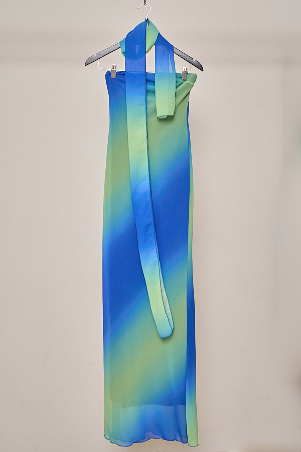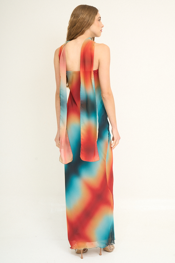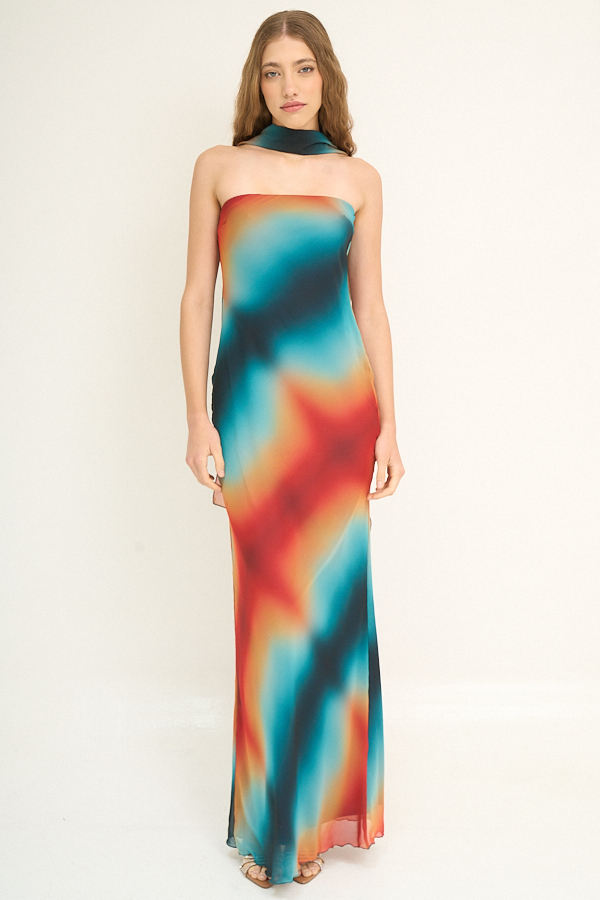 VESTIDO LARGO GASA ESFUMADO STRAPLESS LAZO