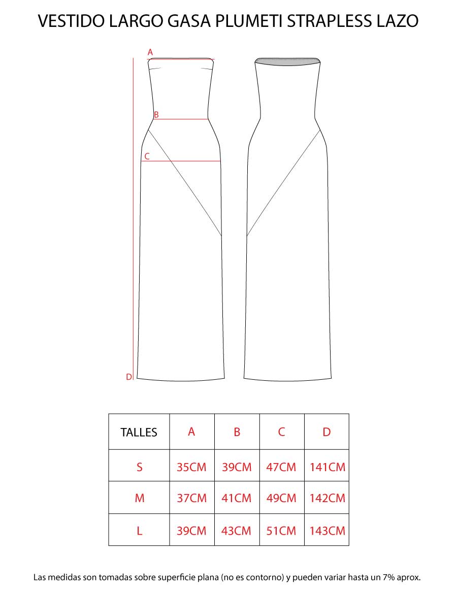 Vestido largo strapless confeccionado en gasa plumeti, con elástico interno en el escote que brinda mayor comodidad y ajuste al cuerpo. Presenta pinzas en el busto para un calce más favorecedor y un lazo a tono que aporta un detalle distintivo al diseño. El modelo cuenta con forrería interna.