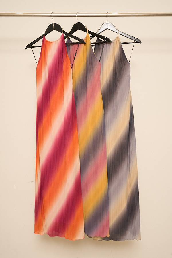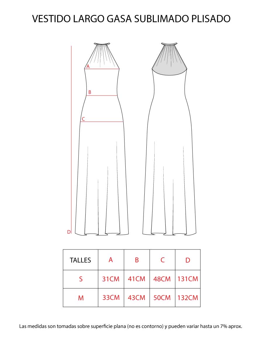 Vestido halter largo confeccionado en gasa sublimada plisada. Presenta accesorio tipo collar integrado y elástico en la espalda para un mejor calce. Lleva forrería interna.
