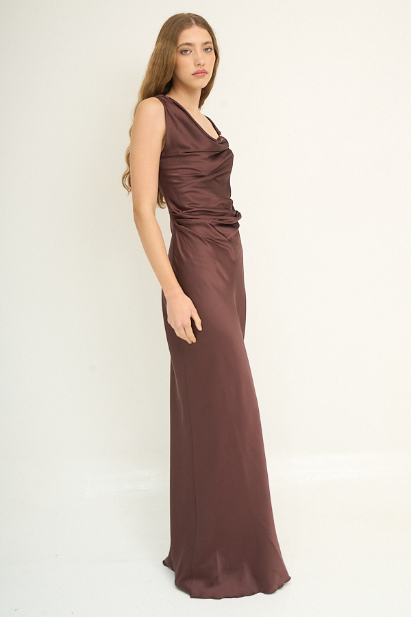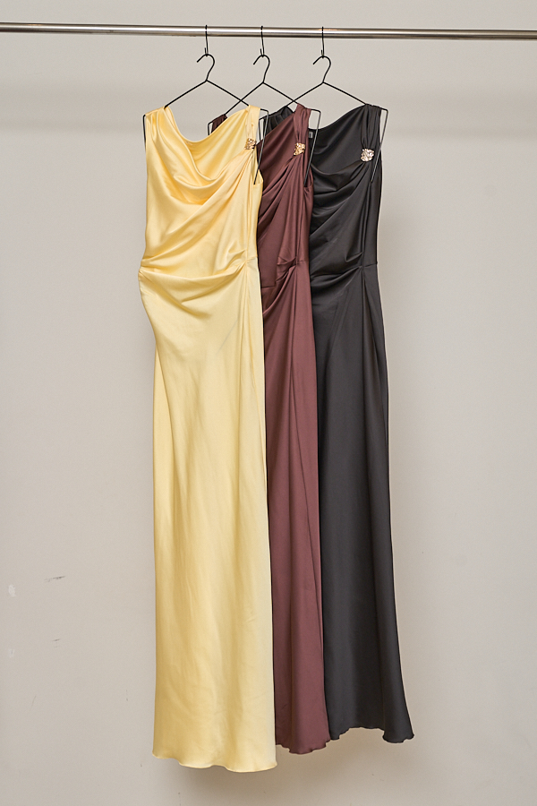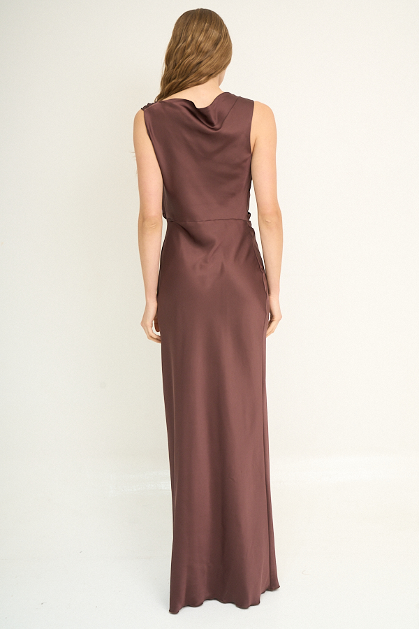 VESTIDO LARGO SATEN UN HOMBRO IRREGULAR ACCESORIO